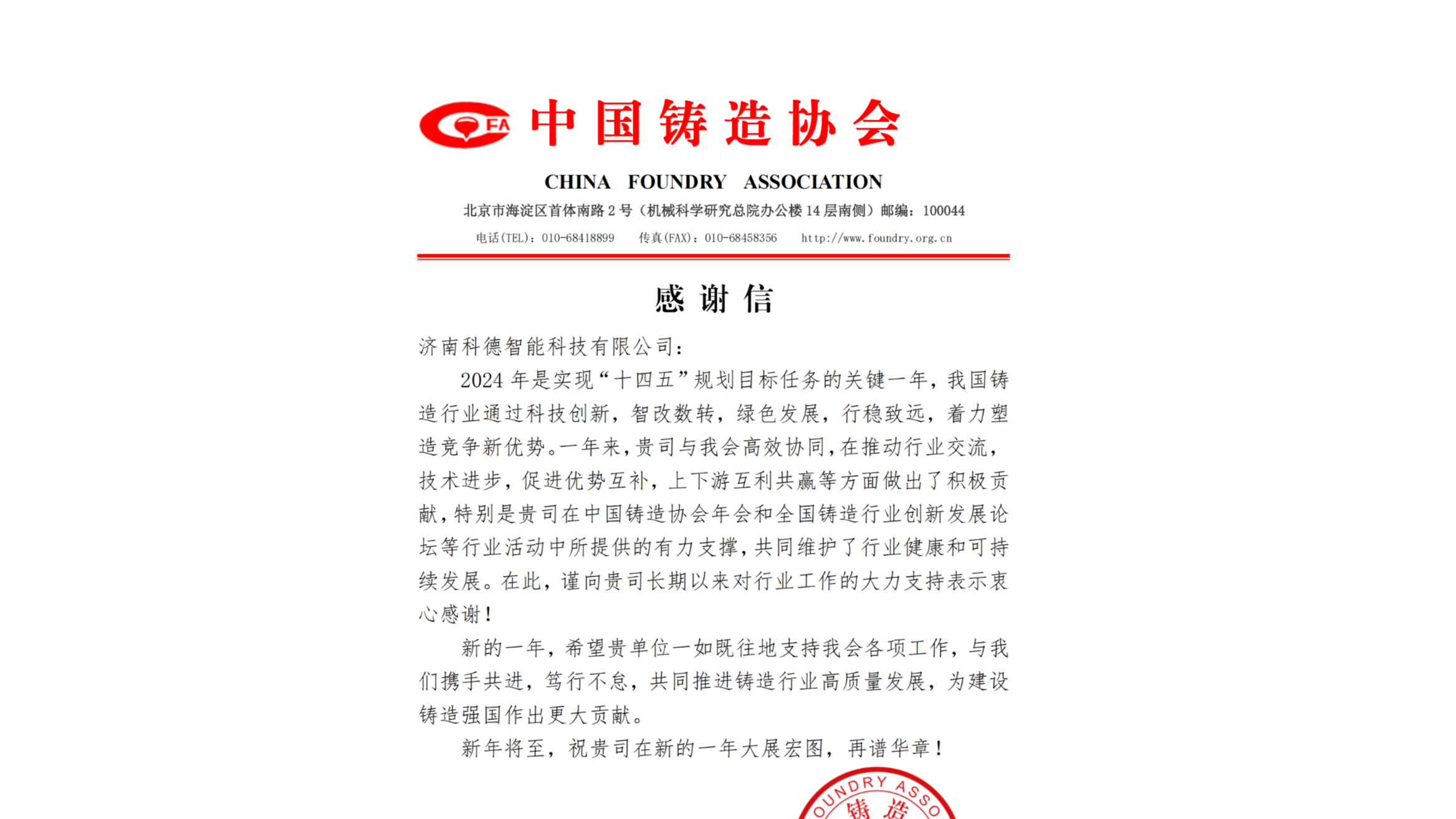 攜手并進,共創輝煌—濟南科德智能科技有限公司榮獲中國鑄造協會2024年度感謝信